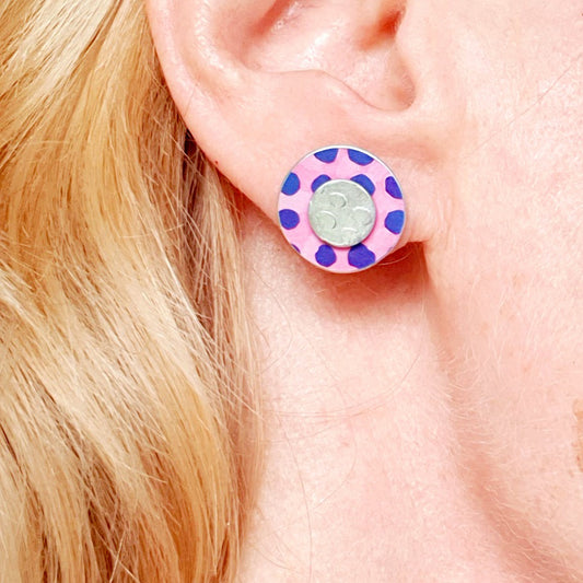 SL1 Pink & indigo spotty stud earrings with textured silver centre