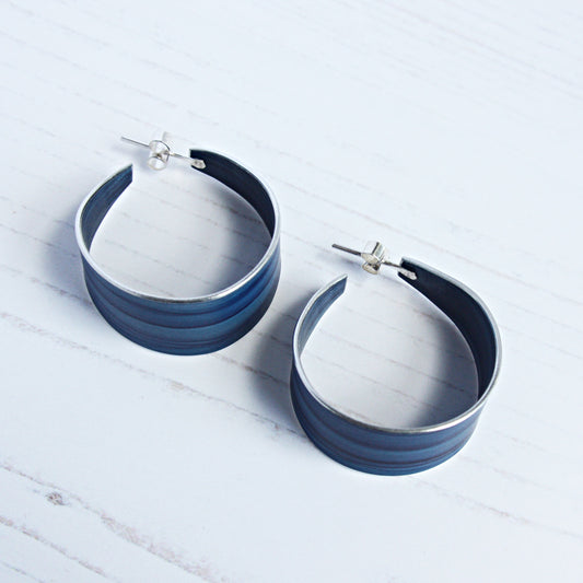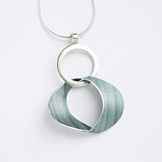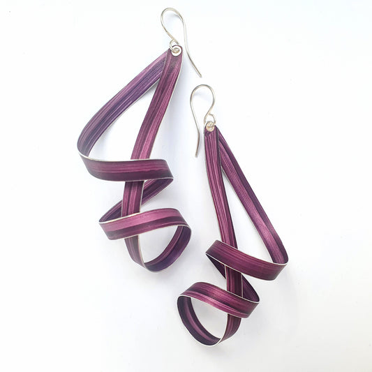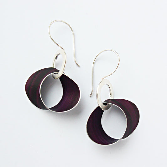 A vibrant collection of jewellery comprising of hand-dyed anodised aluminium shapes looped through sterling silver hoops.