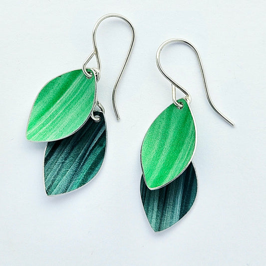 SL16 Silver double disc drop earrings with light and dark green glass beads