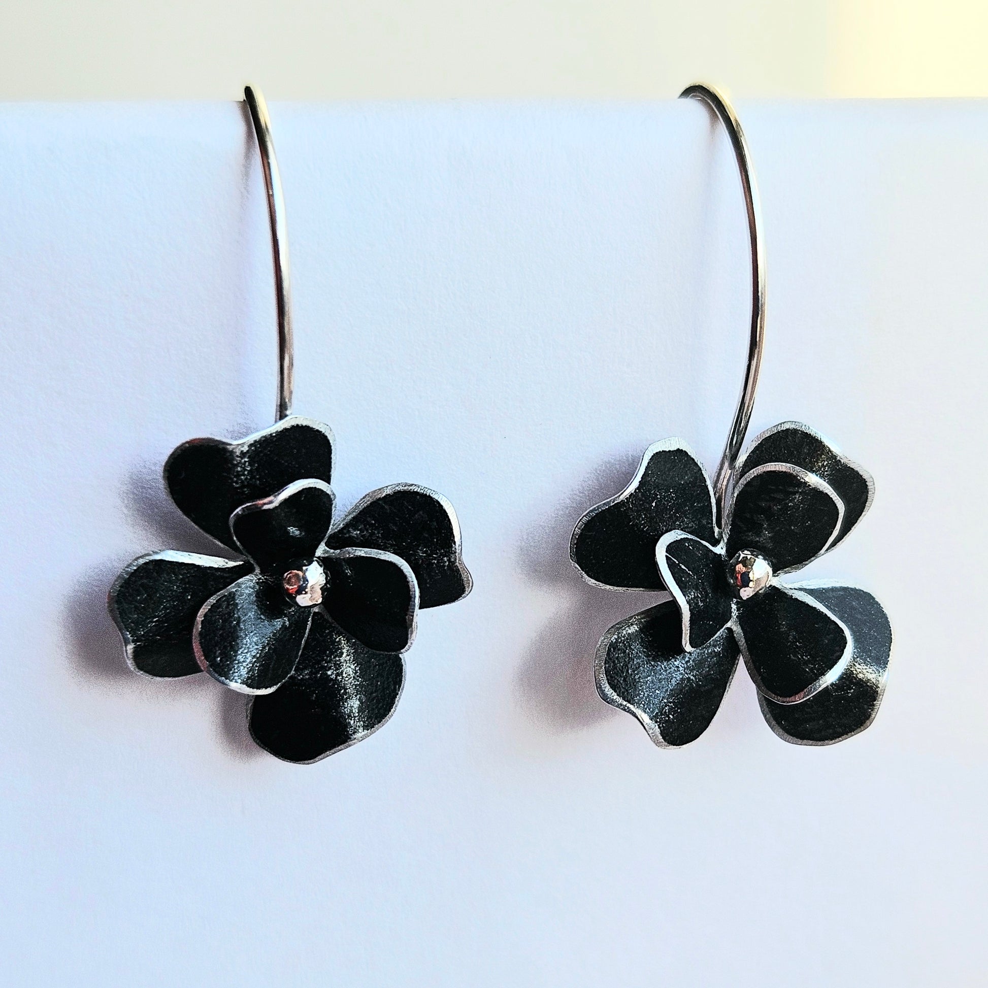 Black aluminium double rosa flower hangs on silver earwire and ball. The flower is 15mm wide and drops 3cm from top of earwire.