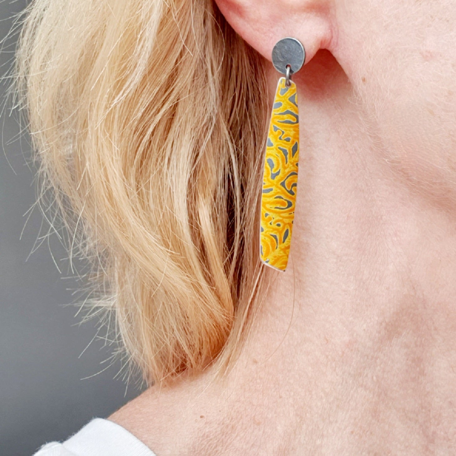 From the Alyssa collection these long tapered earrings are printed aluminium hanging from an oxidised silver disc stud. 5cm long.