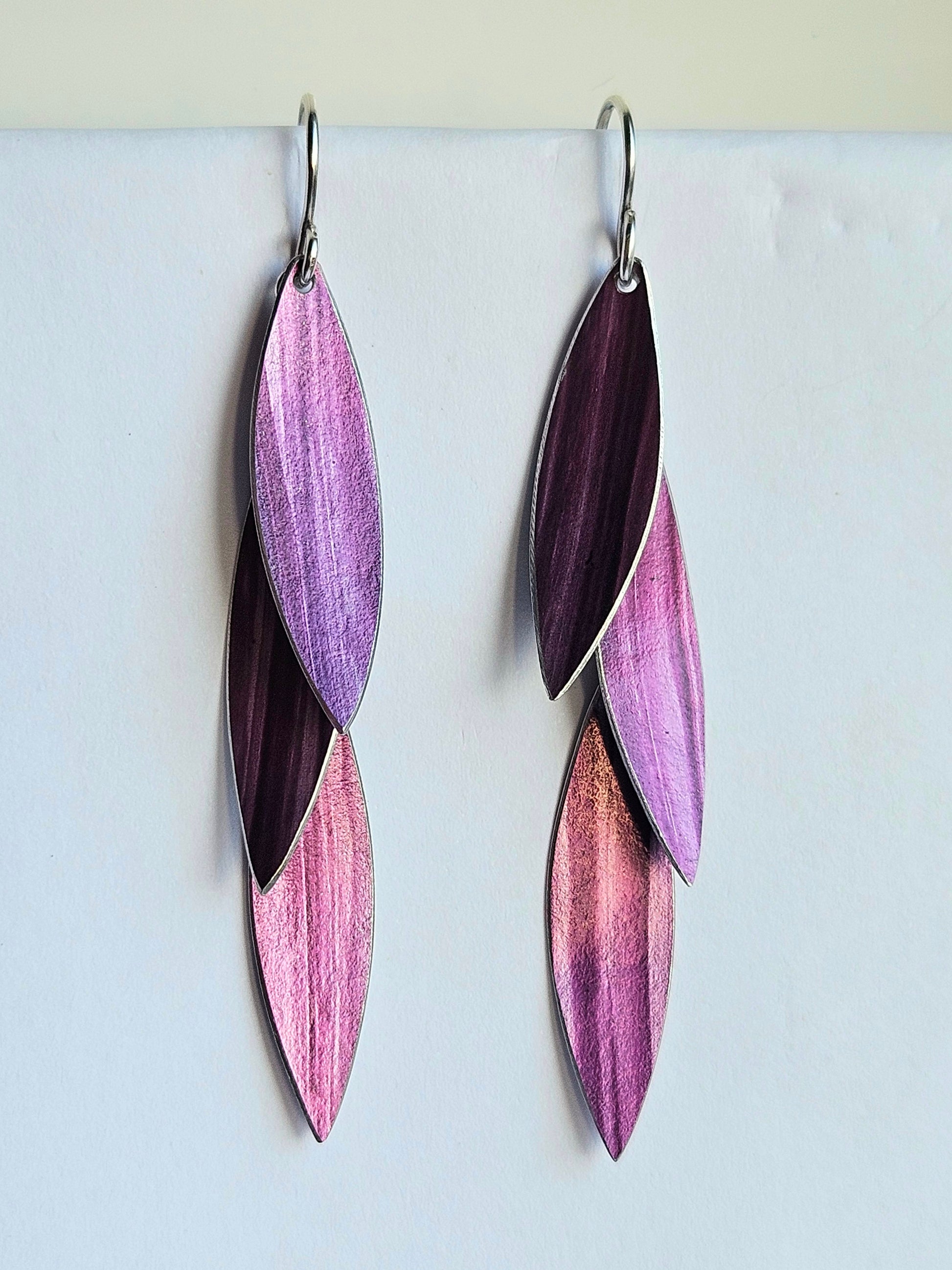 Three leaves of aluminium in stripey berry drop in a cascade from silver wire. Measuring 7cm from top of earwire to base, these are statement earrings. The 3 leaves together are 6cm in length.