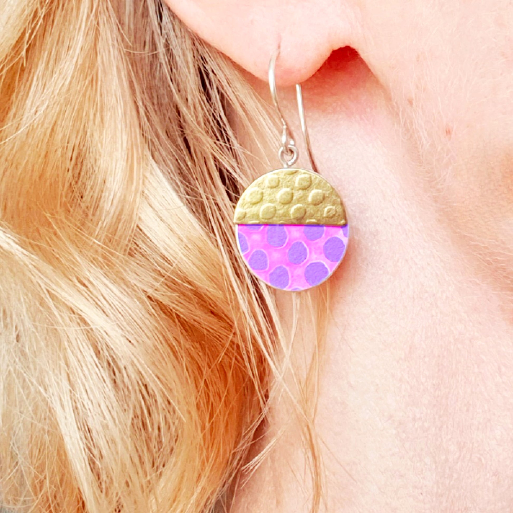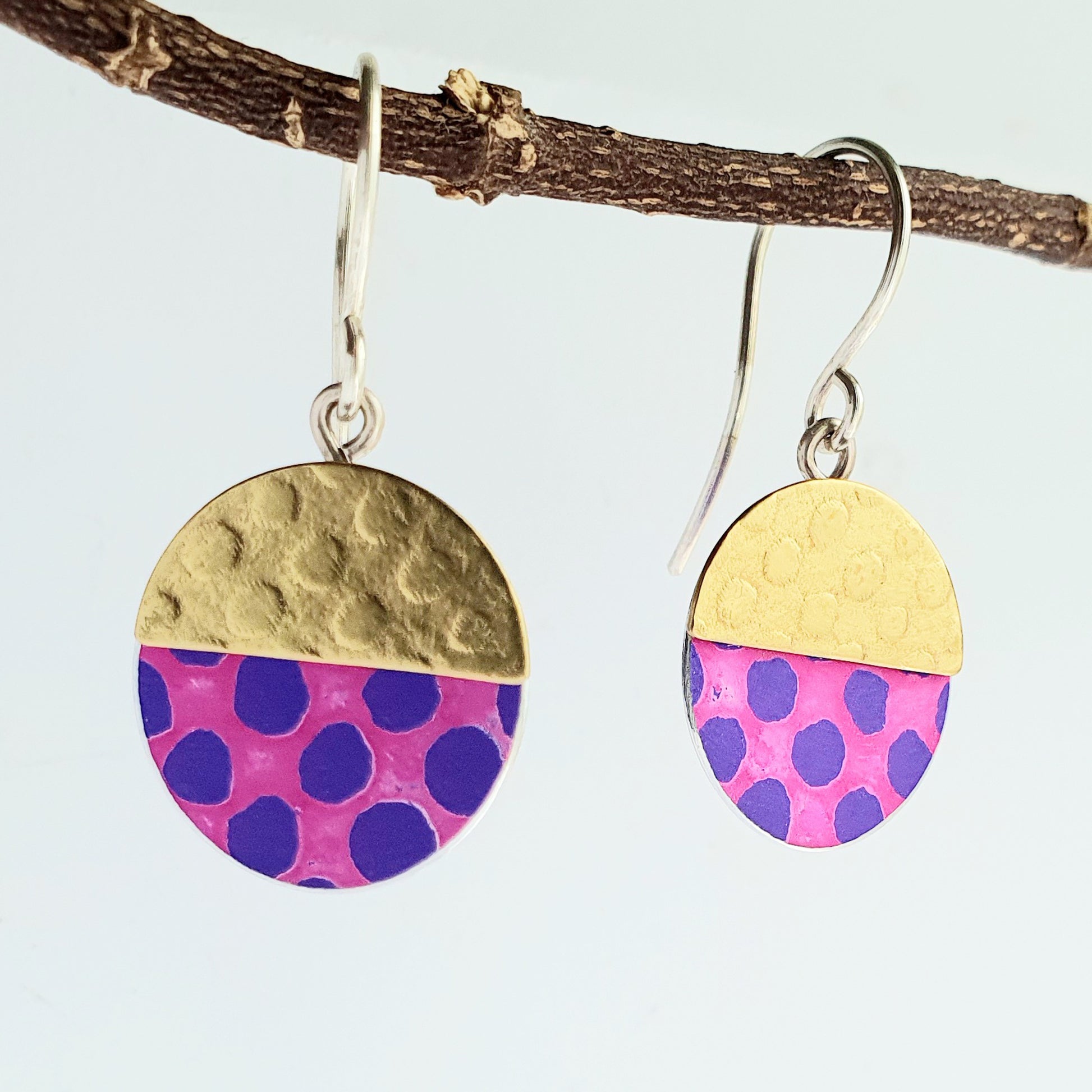SL14 Spotty textured brass and purple/majenta drop earrings