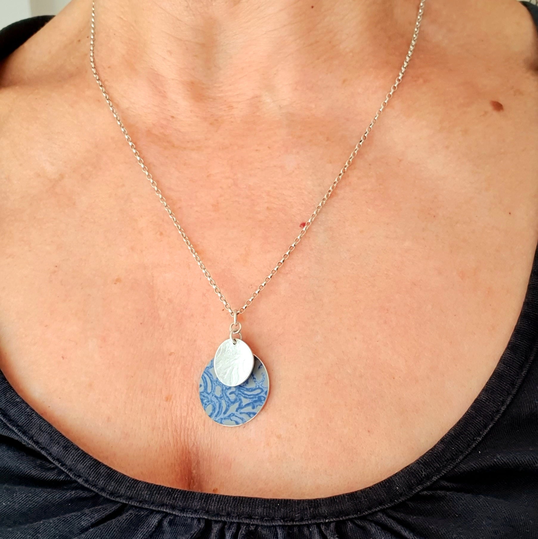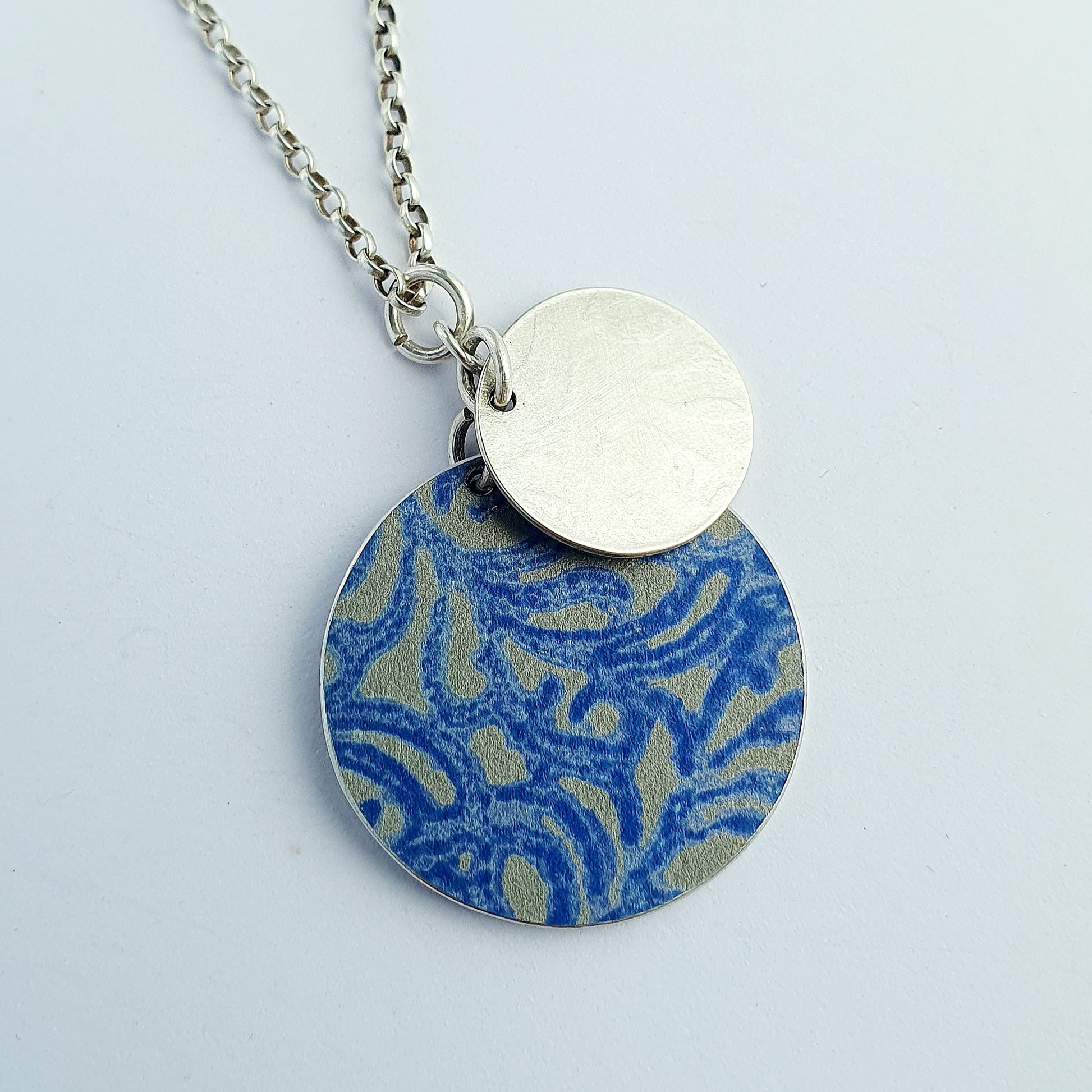 A 15mm disc in textured silver and a 25mm disc in pale indigo print on grey background hang on a 16" silver chain with a 2" extension.