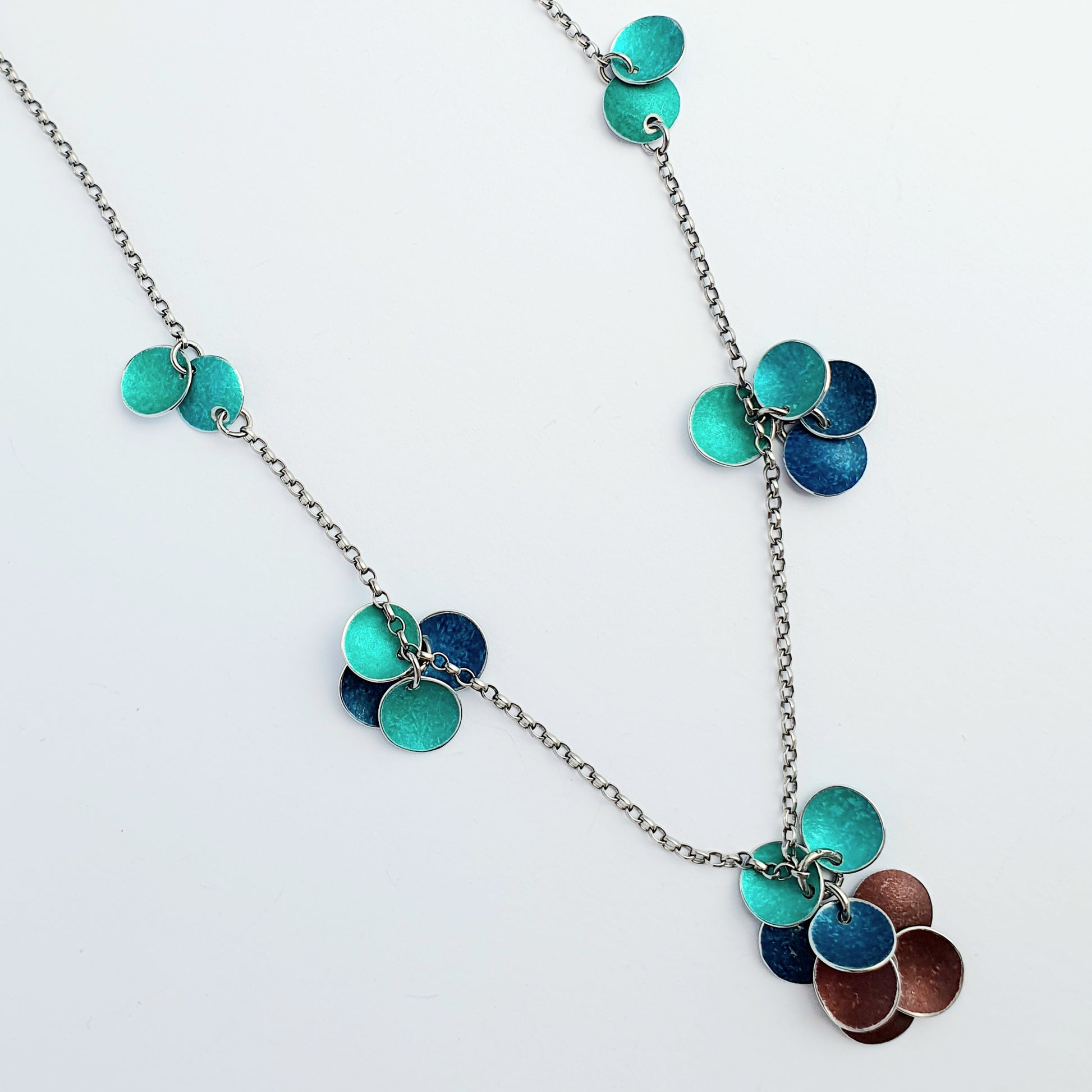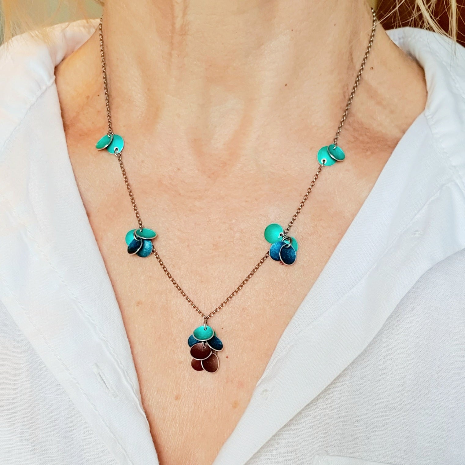 A unique necklace made up of little concave discs of aluminium hanging on oxidised silver chain, measuring 15.5" with a 2" extension.