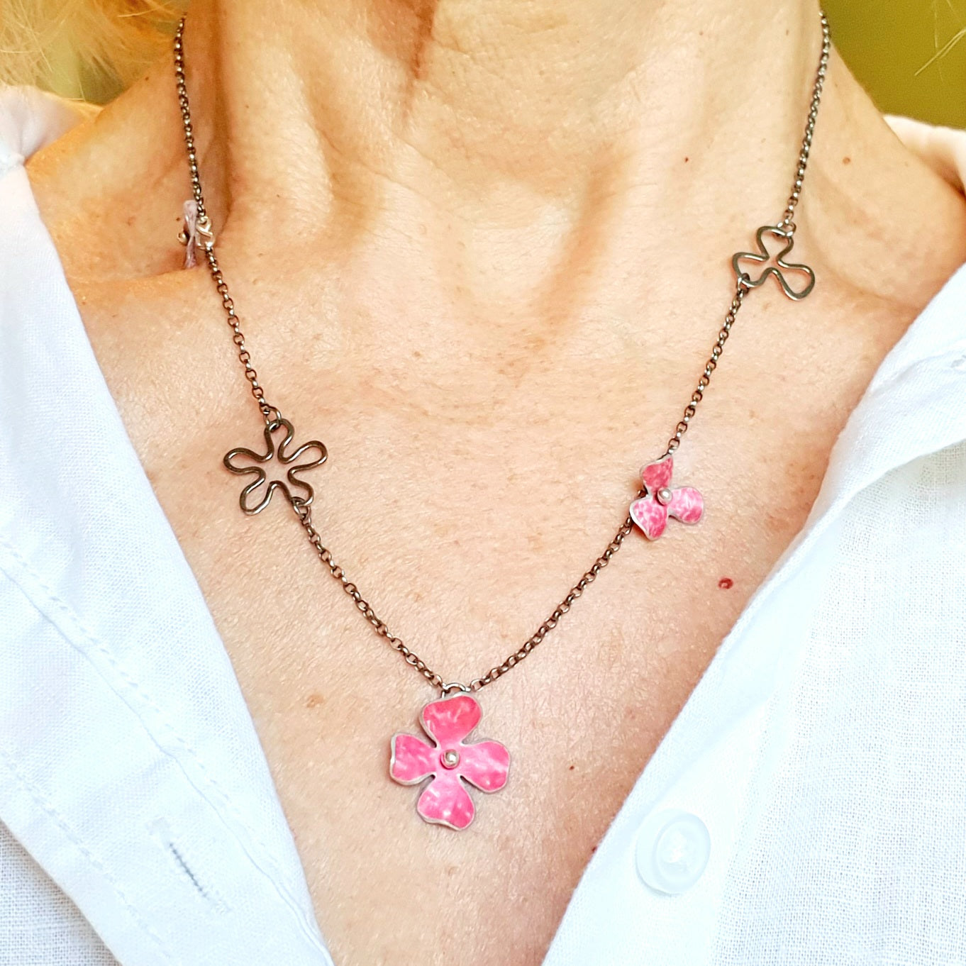 A pretty delicate floral necklace in aluminium on oxidised silver. Little coral coloured aluminium flowers and oxidised silver wire floral shapes sit on a 17" long chain.