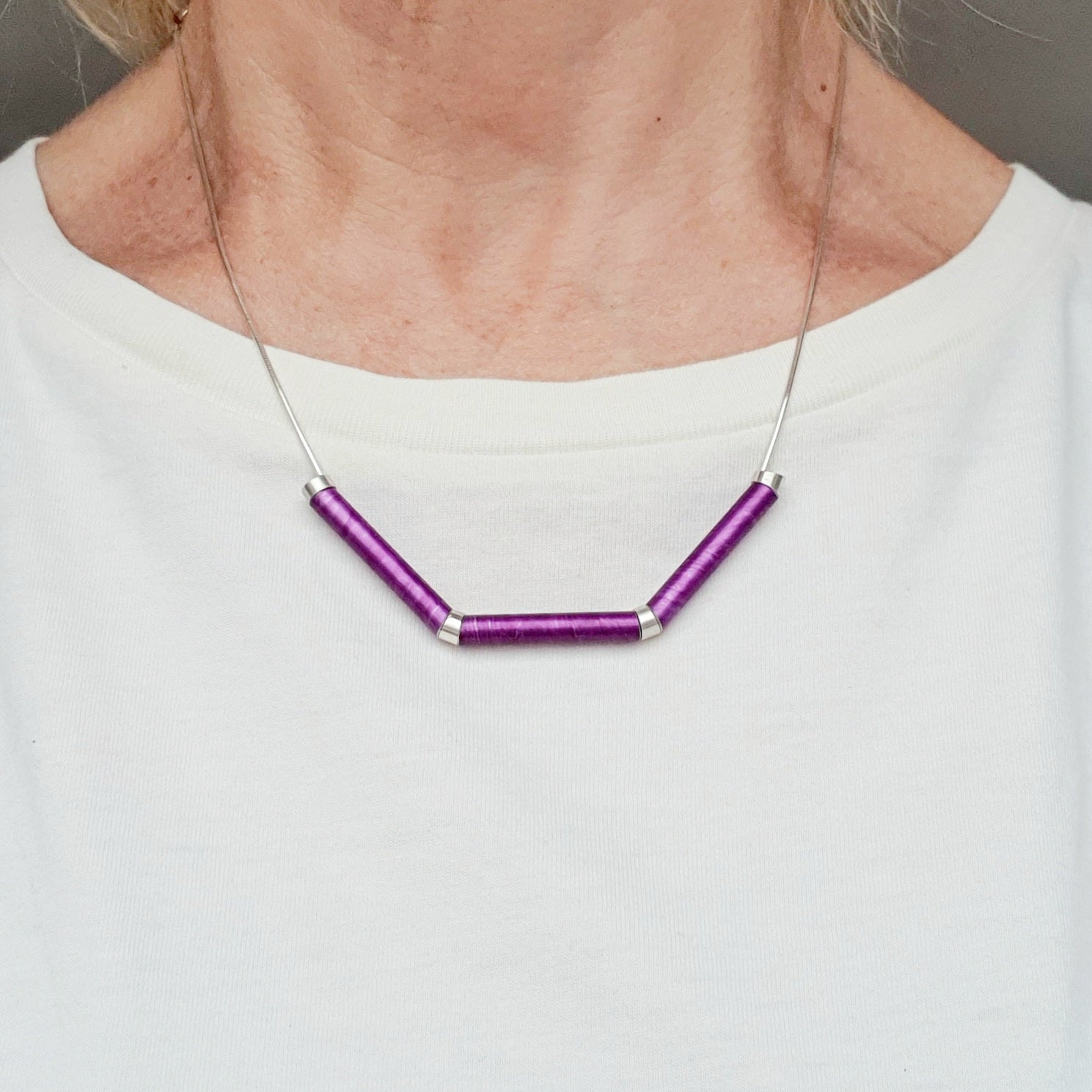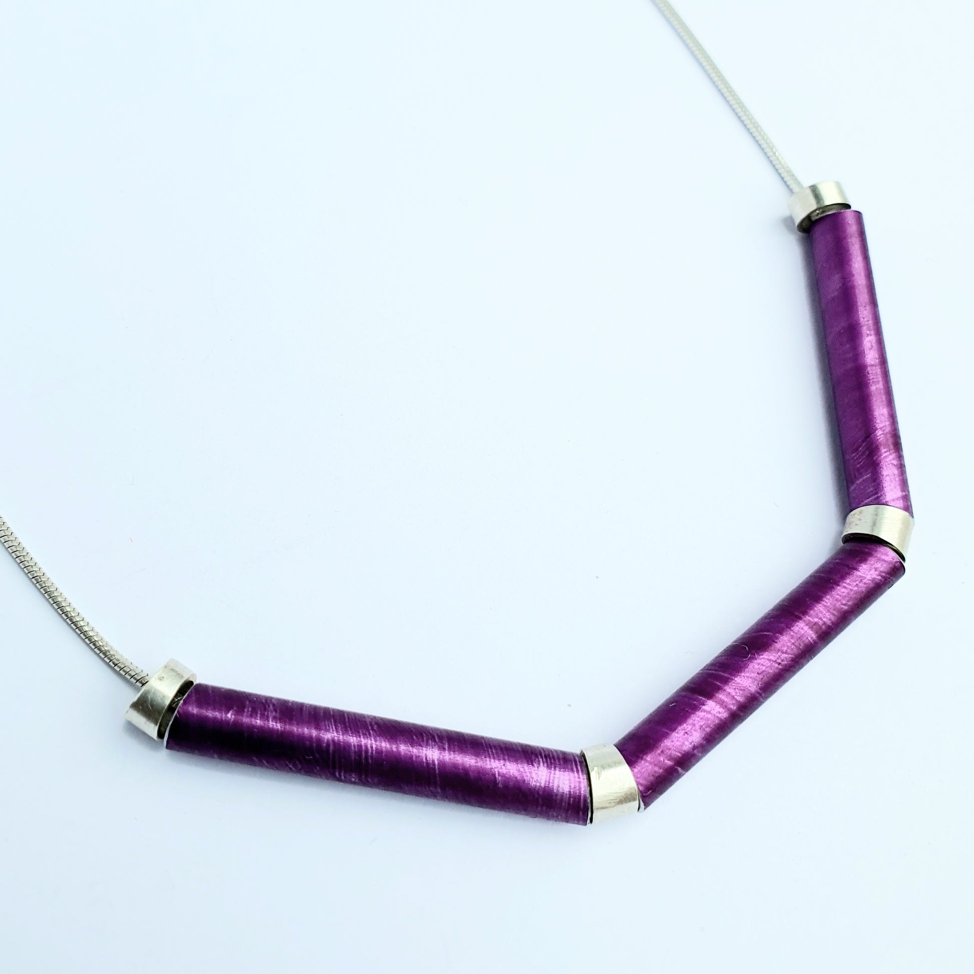 Three hand-dyed purple aluminium tubes separated with little silver sections are strung on a 16" silver snake chain with a 2" extension.