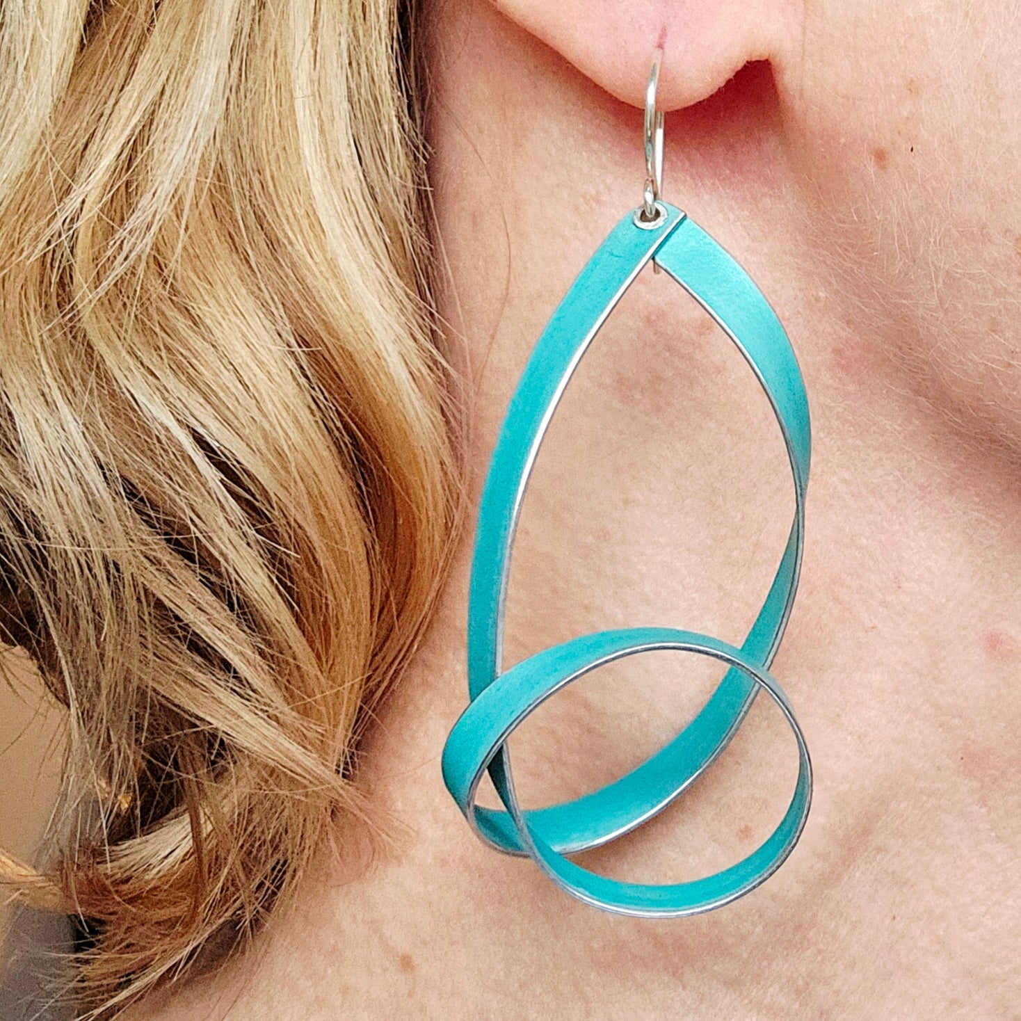 These drop earrings are made in a single loop of jade anodised aluminium tube riveted at the top and hanging on silver ear hooks. They are 6cm long and 3cm wide, hanging 7cm from top of earwire.