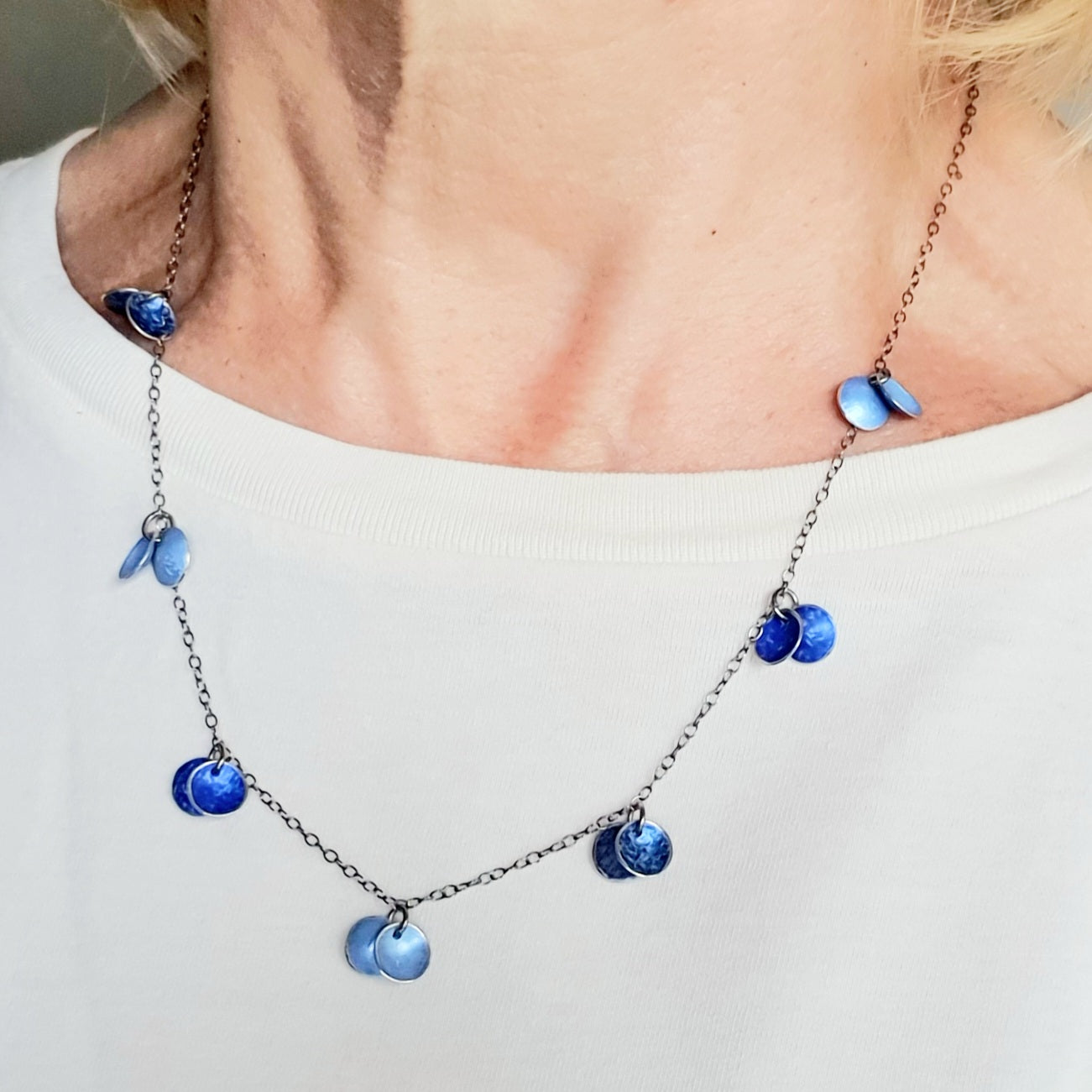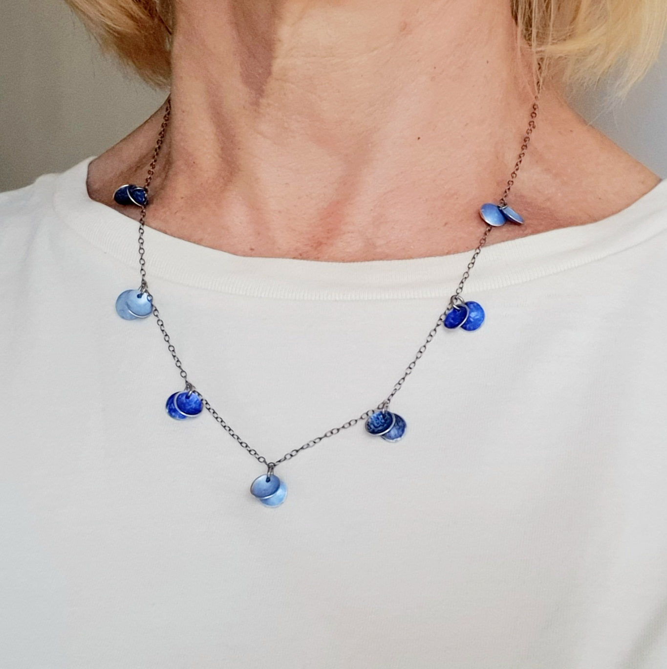 Seven little blue 2 disc clusters hang from oxidised silver chain measuring 18.5" in length.