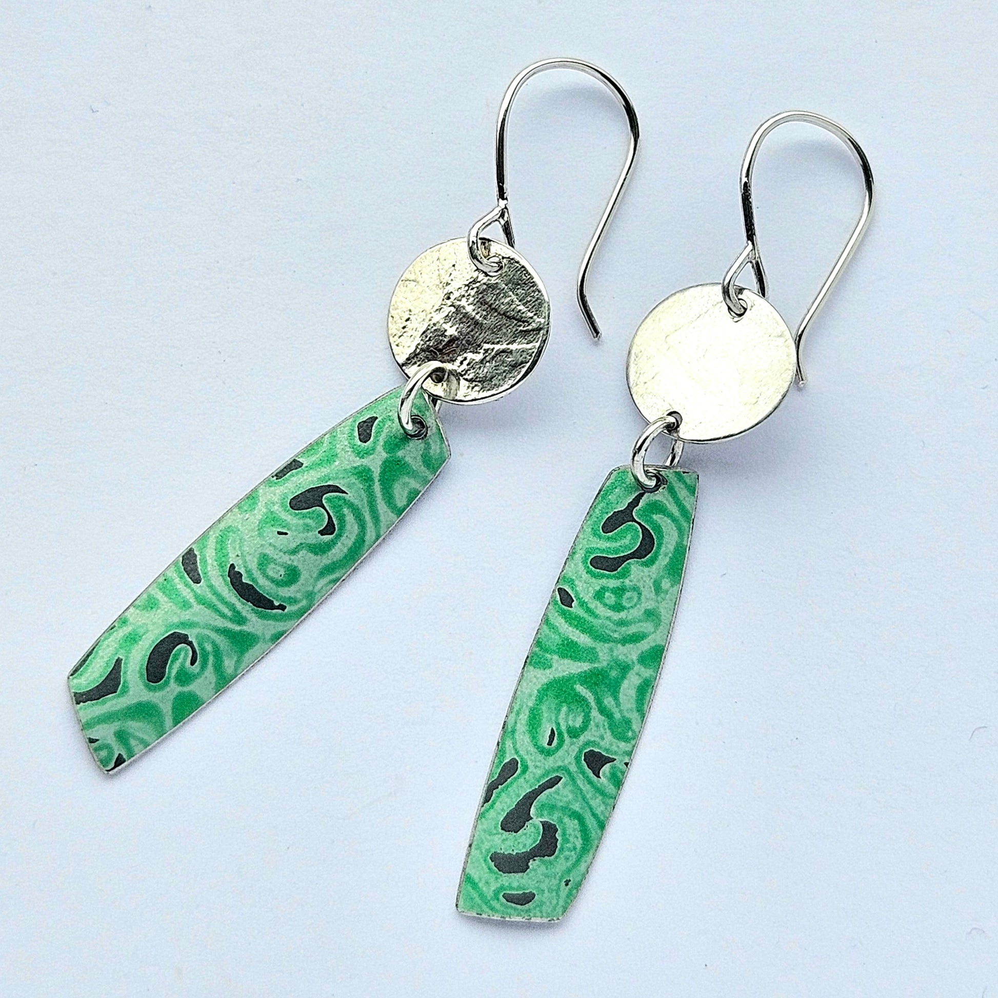 Pretty drop earrings made in textured polished silver and Alyssa printed aluminium in green. They hang 5.5cm from top of earwire to bottom and are 4.5cm long.