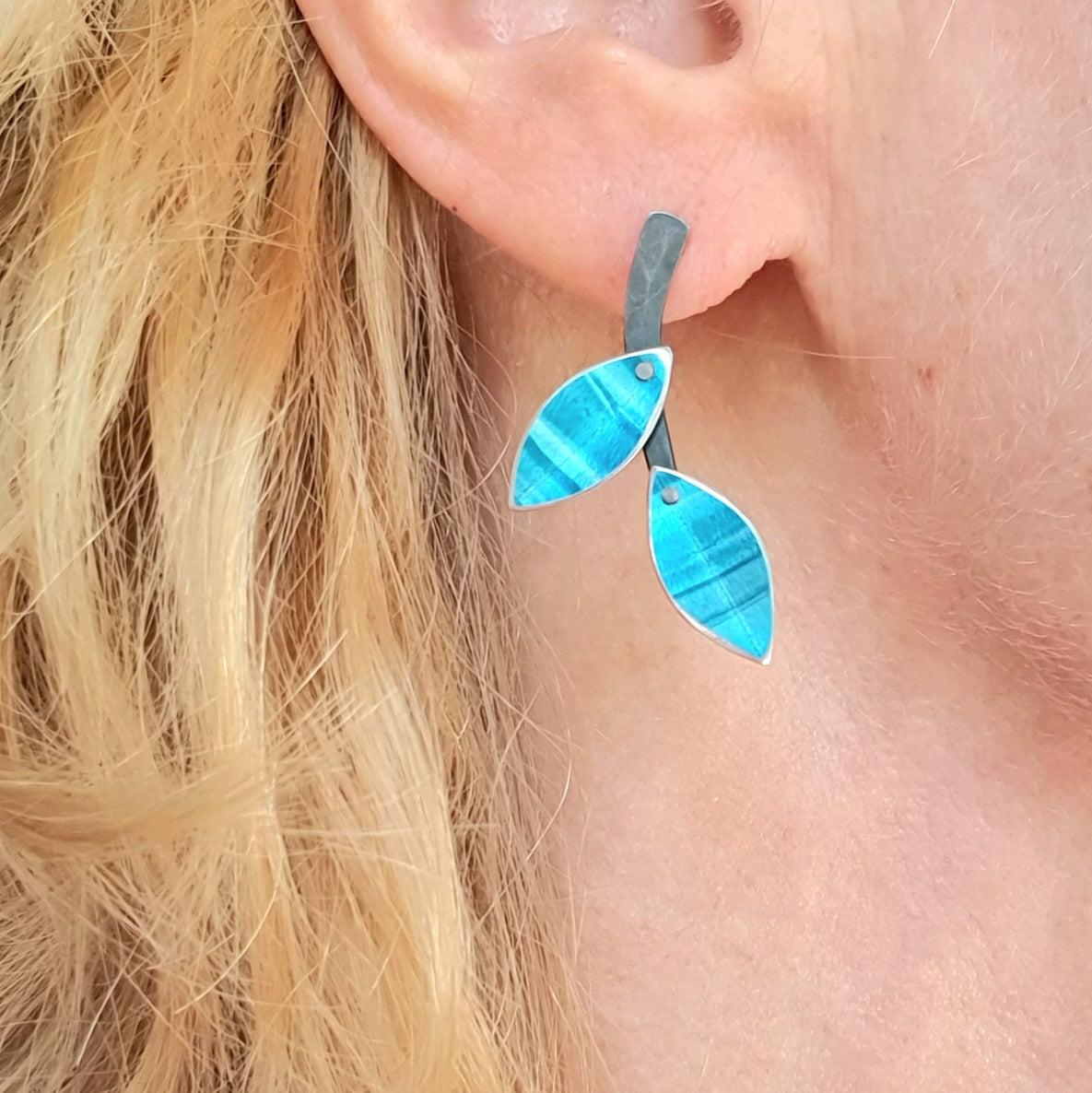 These attractive leaf stud earrings are made in oxidised silver with little hand dyed aluminium leaves riveted to its stem. 3cm long from end to end.