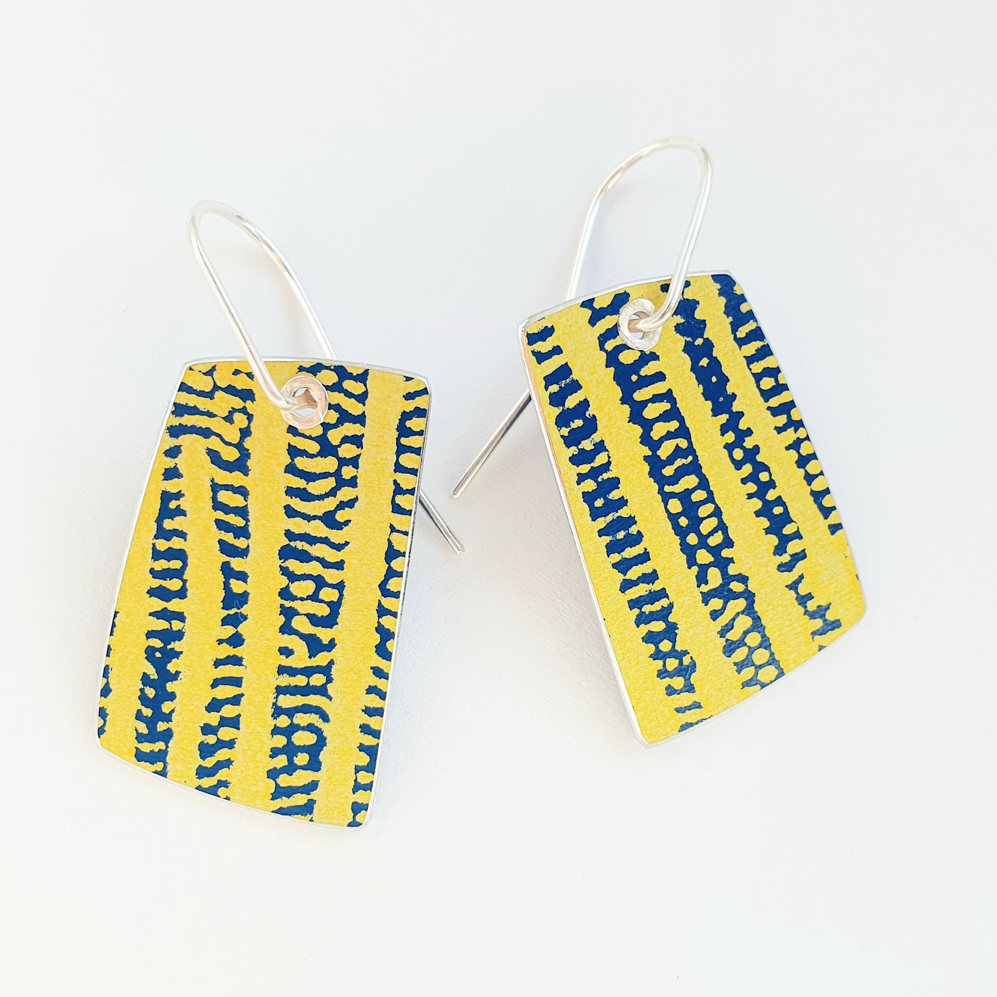 Anodised aluminium rectangle drop earrings with silver tube rivet and sterling silver earwires. 18mm wide and 28mm long.